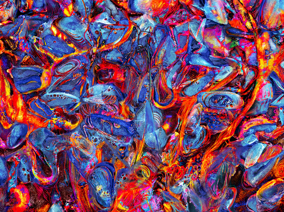 This project began as I walked around my neighbourhood, taking photographs of fallen leaves, frozen ice, and rippling puddles. Then, back in my studio, I painted canvases with fierce colours and strokes, then photographed those paintings. In Photoshop, I combined my photographs of nature and of my paintings, creating fantastical layer upon layer. The final step, digital drawing, involved scraping away one layer to reveal the other underneath. Multiple layers formed different universes, one visible through the cracks in another. In the resulting compositions, I recognised the friction between a personal landscape that was deep with grief and the vibrancy of the imagined life I missed.